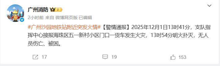 另据广州消防消息,2025年12月1日13时41分,支队指挥中心接报海珠区五一新村小区门口一货车发生火灾,13时54分明火扑灭,无人员伤亡、被困。